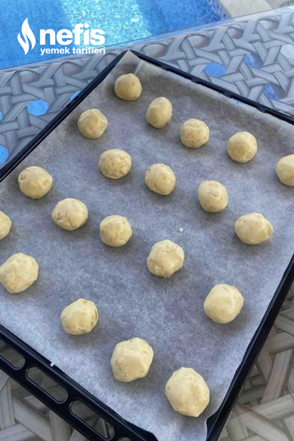- Hamur dinlendikten sonra, hamurdan ceviz büyüklüğünde modüller koparıp, elinizle yuvarlayıp top formunu verin ve tepsiye dizin.