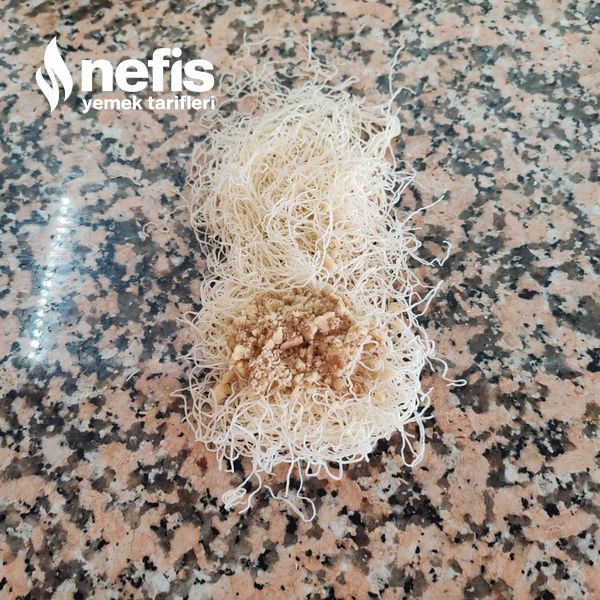 3. Saralım. Kadayıftan avuç içi kadar alıp tezgâha yayalım. Ortasına 1 tatlı kaşığı kadar ceviz içi koyup sıkıca saralım. Rulo biçiminde sararak ya da isteğe nazaran gül üzere kıvırarak form verebilirsin.