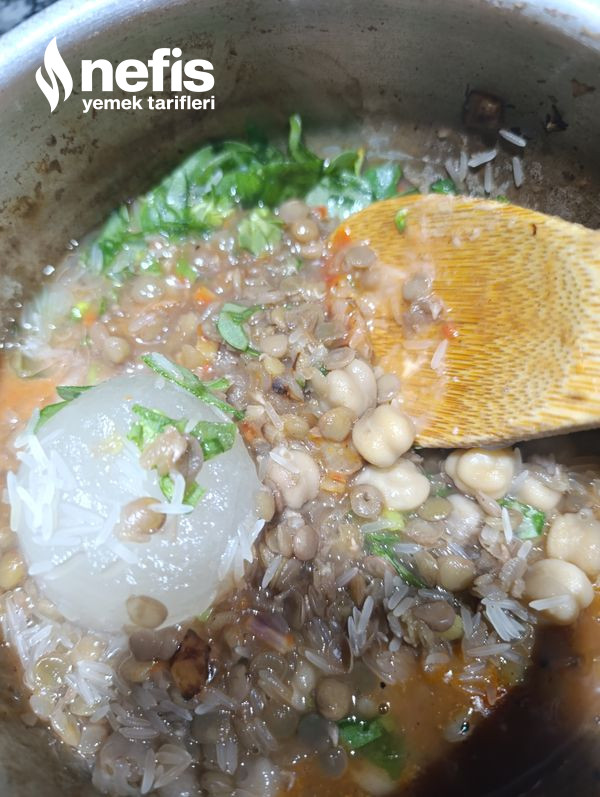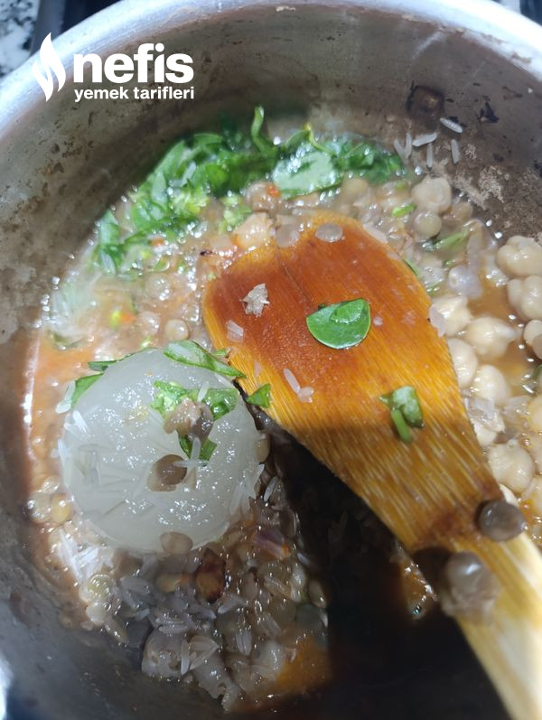 - Doğranmış semiz otu, haşlanmış nohut ve mercimeği ekleyin.