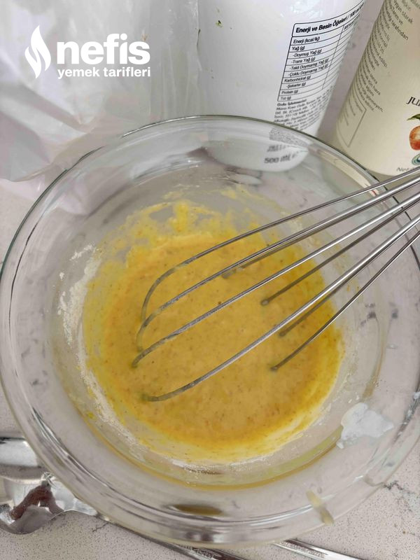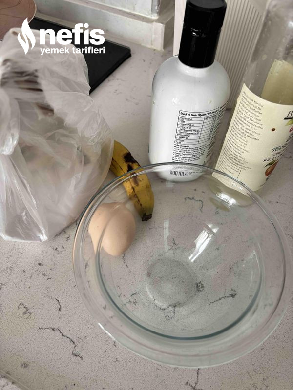 - Bir kaseye yumurtayı, yoğurdu, zeytinyağını, çatla ezilmiş muzu, elma suyunu koyup güzelce çırpalım.