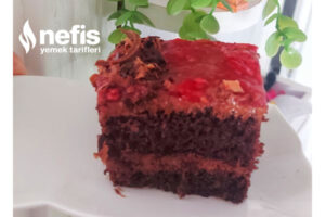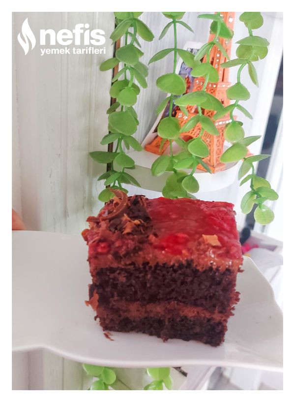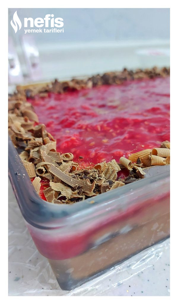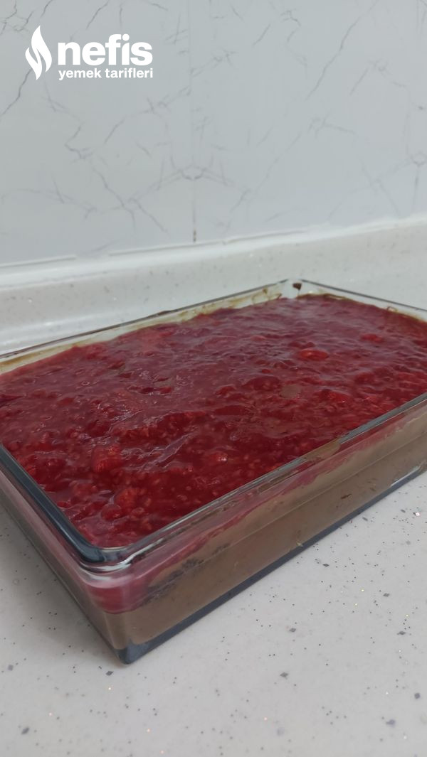 - Pasta katlarını birleştirmek için; kekin alt katını koy, üzerine çikolatalı kremayı sür. Üst katı yerleştir, tekrar krema sür. Üzerine frambuazlı sosu dök. Kenarlarını çikolata kırıklarıyla kapla (hafifçe bastırarak).