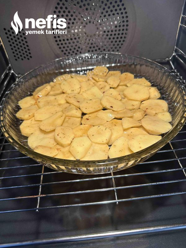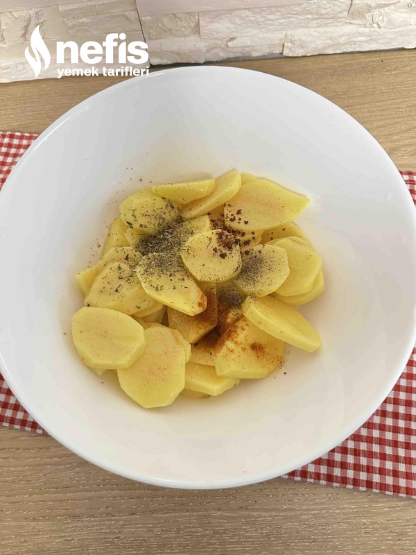 - Patateslerin kabuğunu soyalım ve yuvarlak halde ince dilimleyelim karıştırma kabına alalım üzerine sıvı yağ, tuz ve baharatları ek edelim karıştıralım uygun fırın kabının alt tabanına boşluk olmayacak formda dizelim, 200 derece evvelden ısıtılmış fırında 15-20 dk pişirelim.
