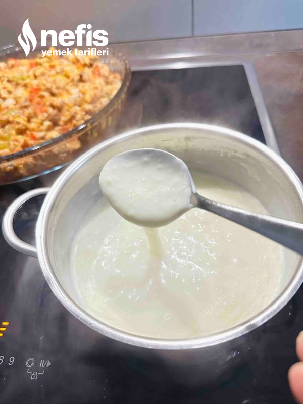 - Beşamel sos için; 1 yemek kaşığı tereyağı tencerede eritelim üzerine unu ek edip kokusu çıkıncaya kadar karıştırarak kavuralım üzerine sütü ek edip daima karıştırarak yoğunlaşıncaya kadar pişirelim.