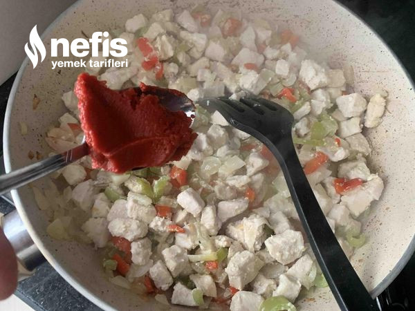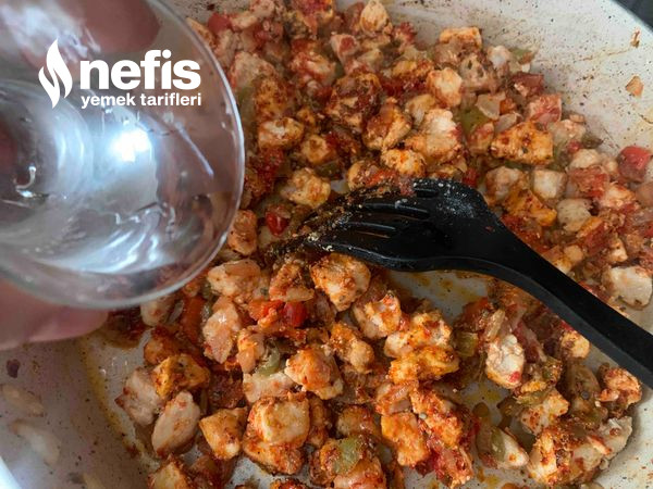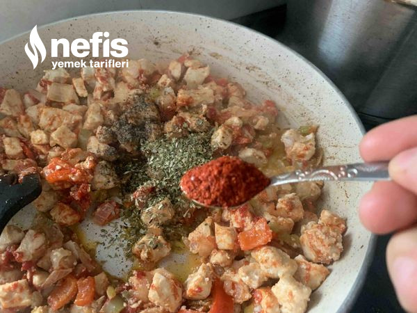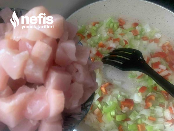 8. İç harcımız için tavuğumuzu küp küp doğrayıp sıvıya koyduğumuz tavamızda suyunu salıp çekene kadar pişirelim.