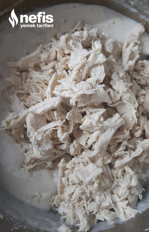 - Haşlanmış olan tavukları bir hoş didikleyelim ve beşamel sosumuza ekleyip bir hoş karıştıralım.