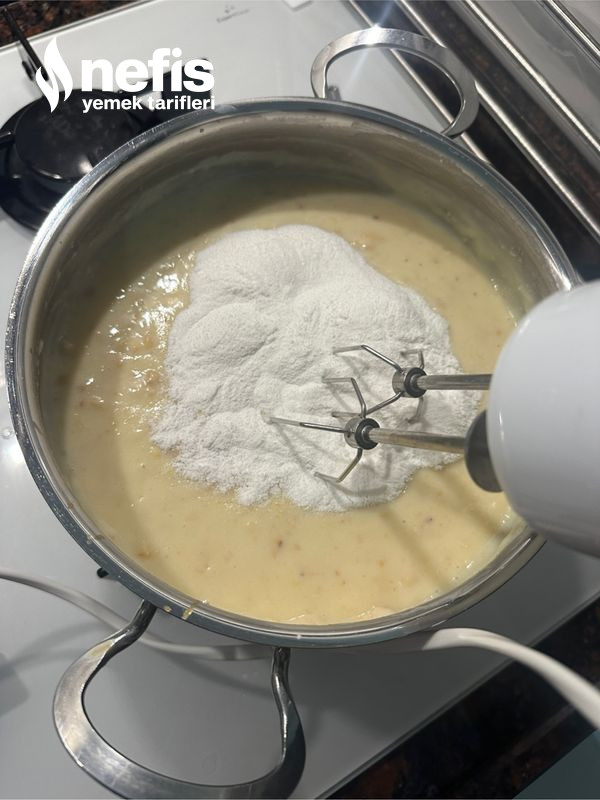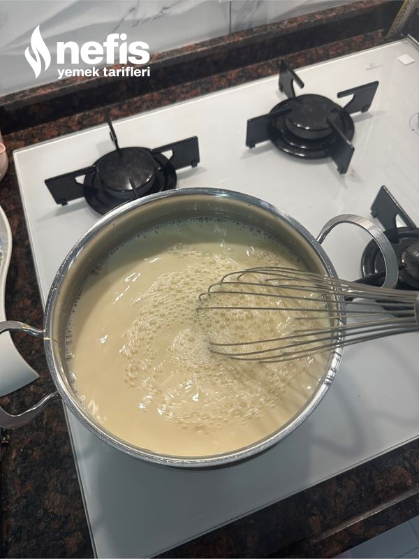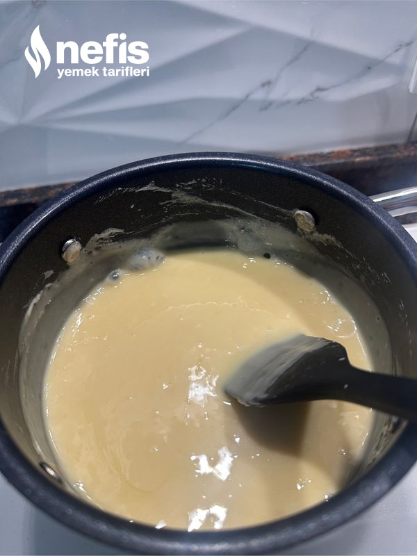- 1 litre sütü tencereye alıyoruz. İçine 3 yemek kaşığı un, 2 yemek kaşığı nişasta, 2 yumurta sarısı, 1 su bardağı şeker ekleyerek ocakta kaynatıyoruz. Kaynadıktan donra altını kapatıp 1 tatlı kaşığı tereyağını ekliyoruz.