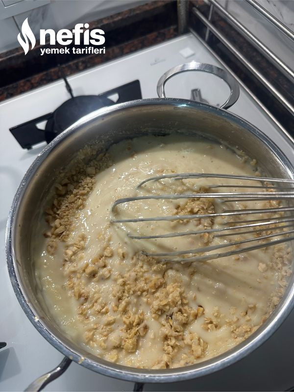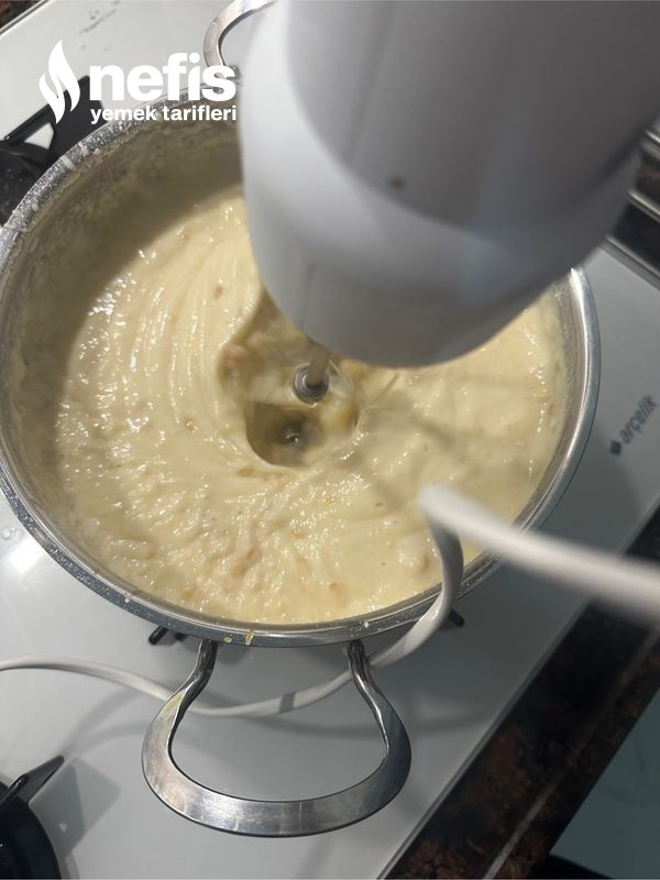 - Muhallebimizin sıcağı çıkınca kıyılmış fındığı ve krem şantiyi ekleyerek mikserle karıştırıyoruz.