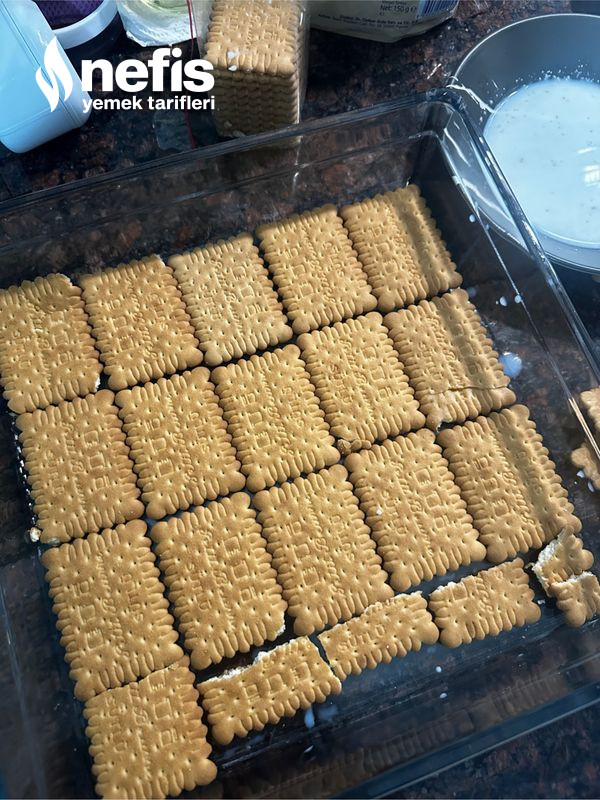 - Borcama bisküvilerimizi sütle ıslatarak diziyoruz ve 3 kat olacak formda ortasına muhallebimizi yerleştiriyoruz.