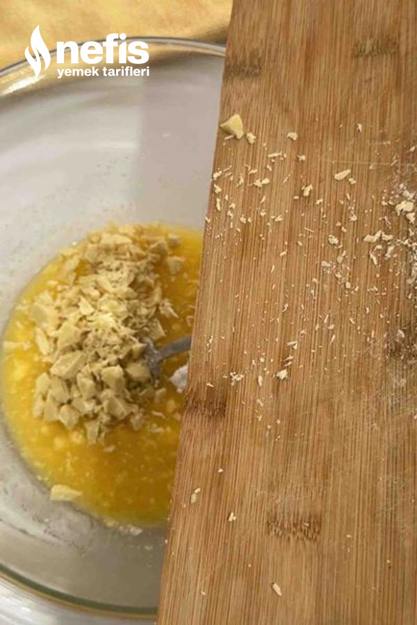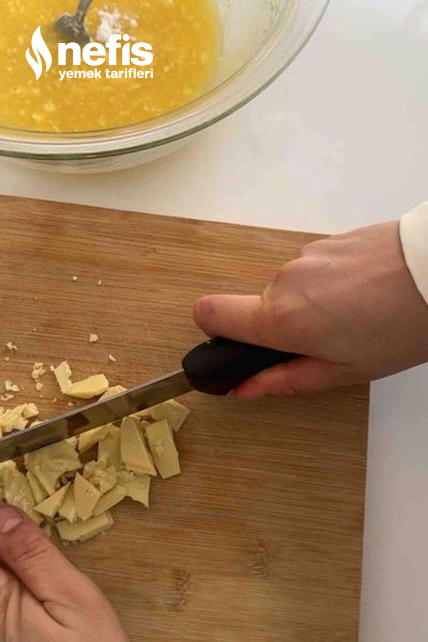 - Un hariç tüm materyalleri uygun bir kaba alıp, karıştıralım, tablet çikolatayı bıçak yardımıyla iri modüllere ayıralım ve bu karışıma ekleyelim.