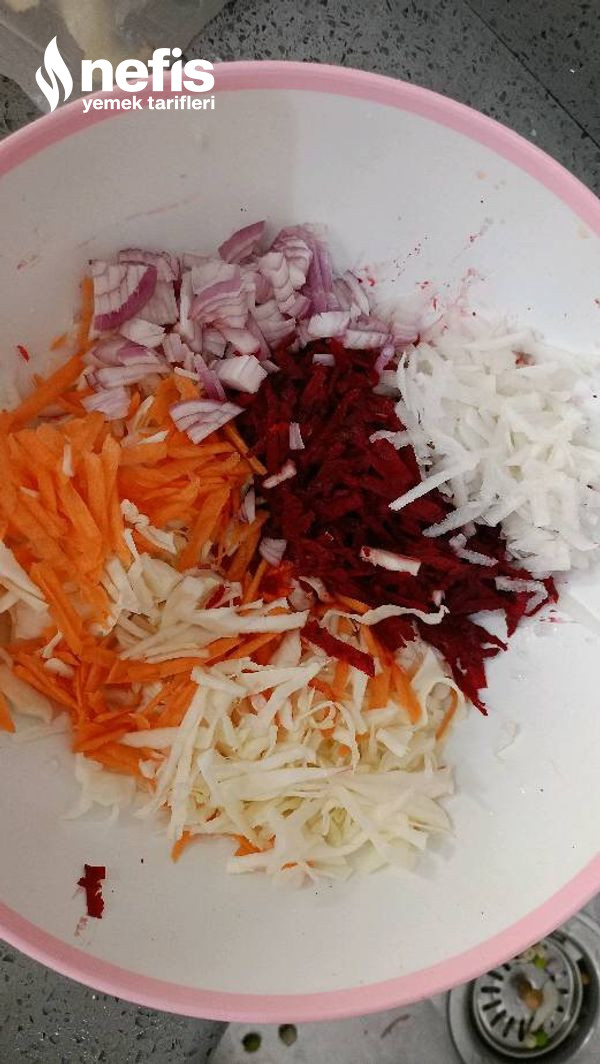 1. Öncelikle bir kaba lahana ince doğranır (sert iç kısmı hariç) havuç ve pancar rendelenir, soğan doğranır.