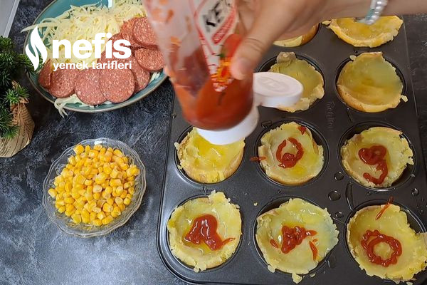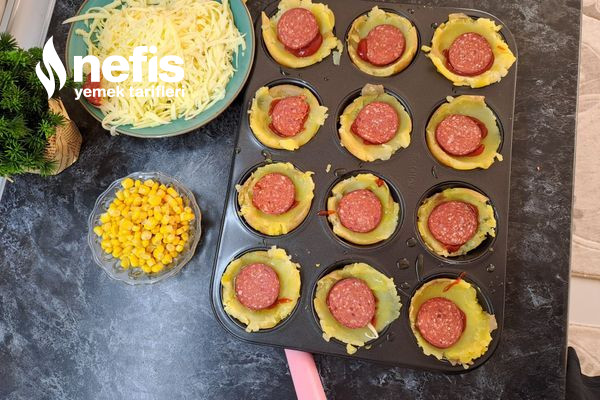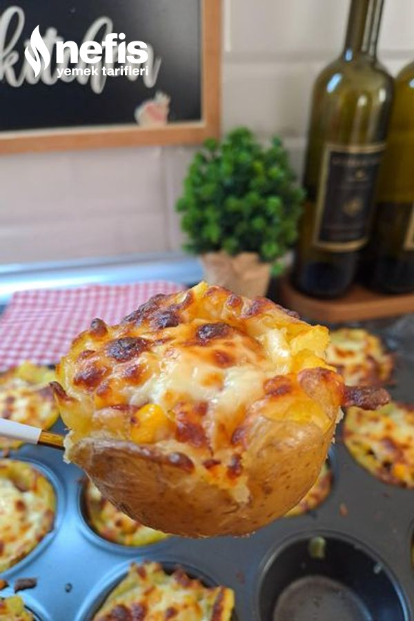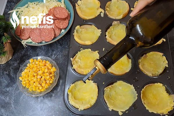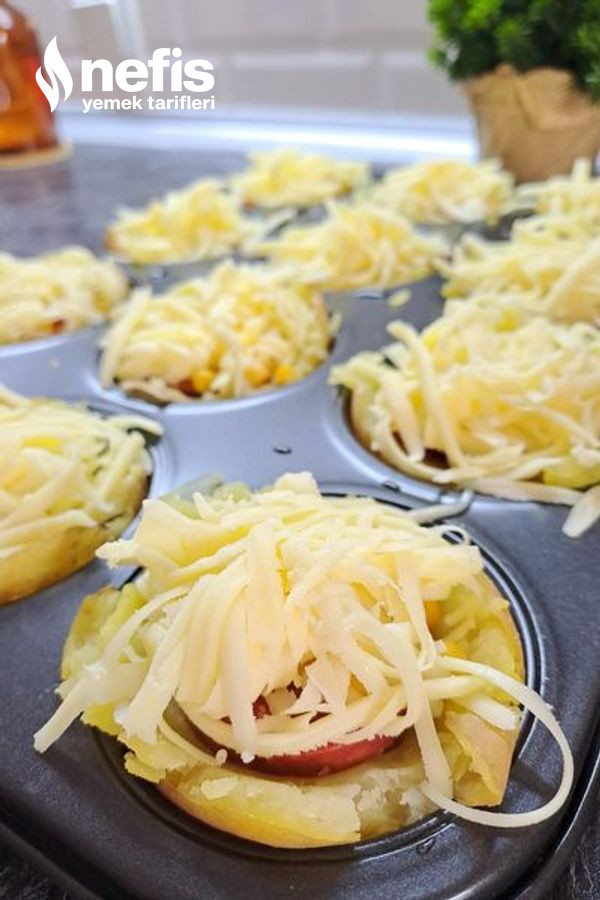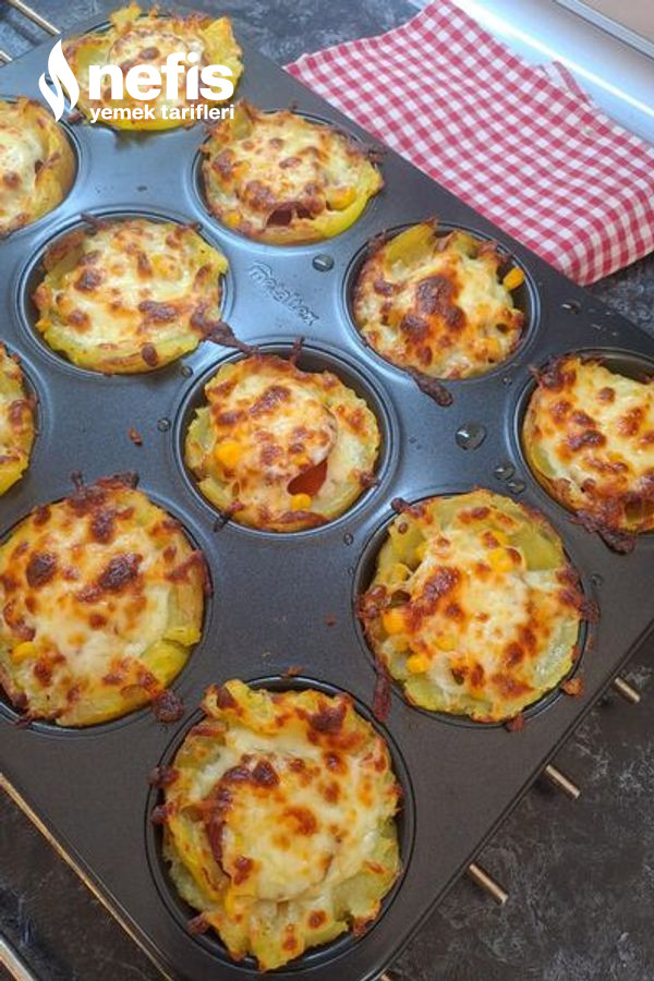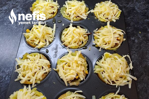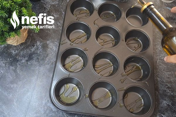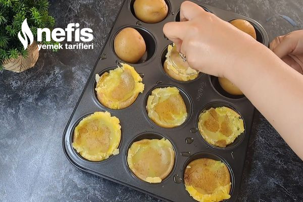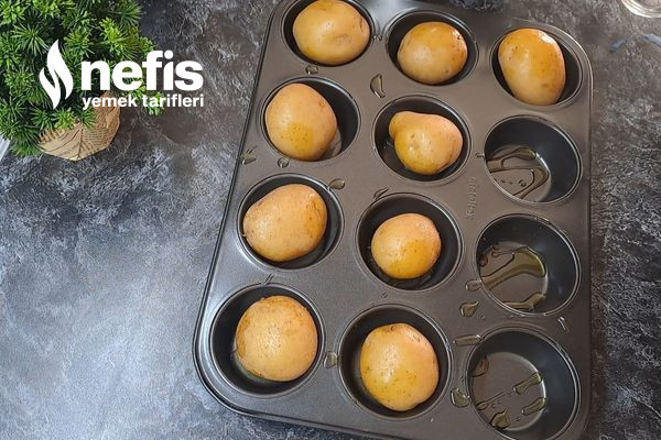 - Daha sonra muffin kalıbını zeytinyağı ile yağlayıp haşlanmış patatesleri ortalarına koyalım.