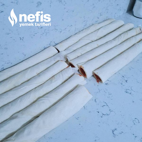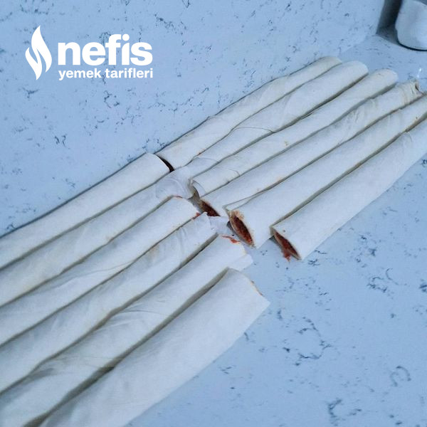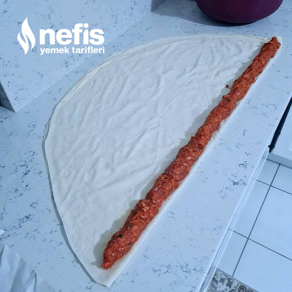 7. Resimde gösterdiğim üzere kıymalı harcı koyup rulo haline getirin.