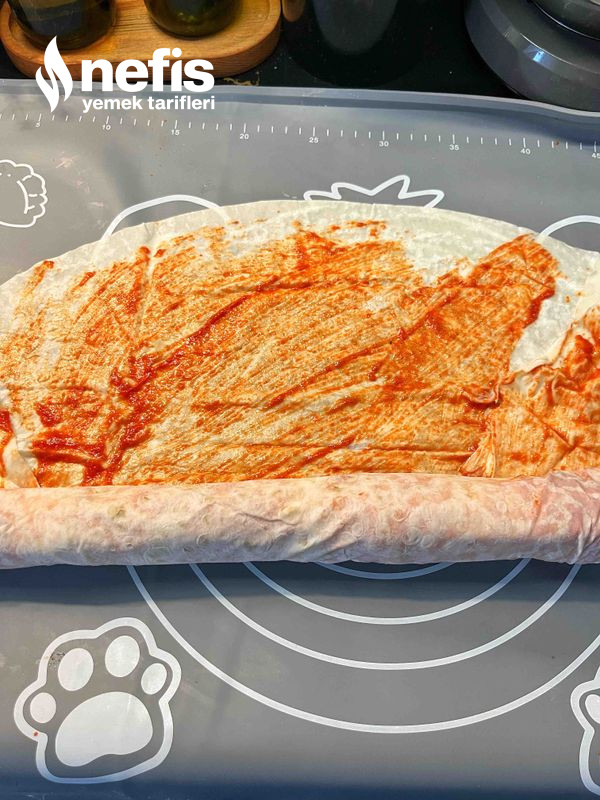 3. 1 yufka alıp üzerine salçalı sostan fırça ile sürelim 2 kenarını karşılıklı katlayalım.