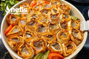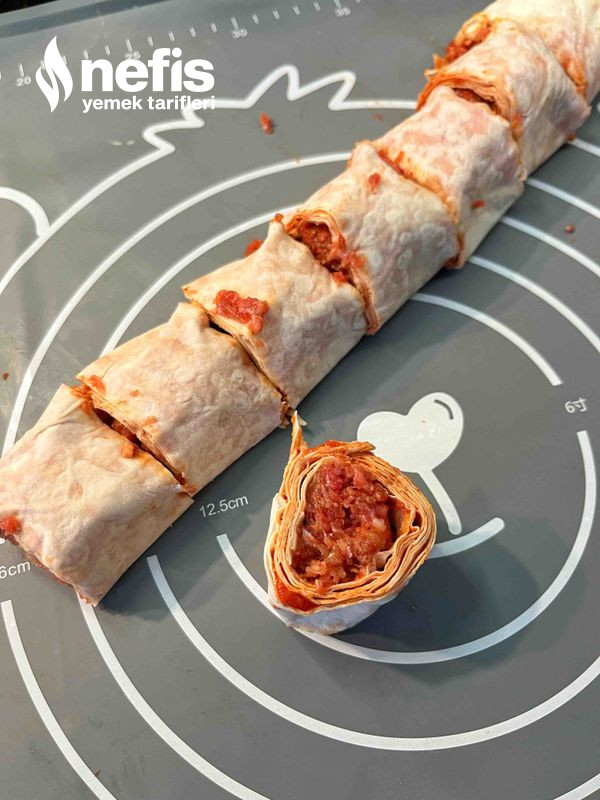 4. Köfteyi her bir yufka için 3 kesime ayıralım kenar kısmını uzun şerit halinde yerleştirelim daha sonra sıkı bir biçimde rulo yapıp 2 parmak genişliğinde keselim.