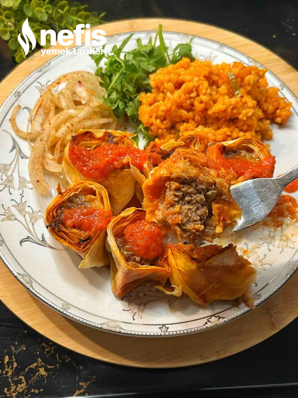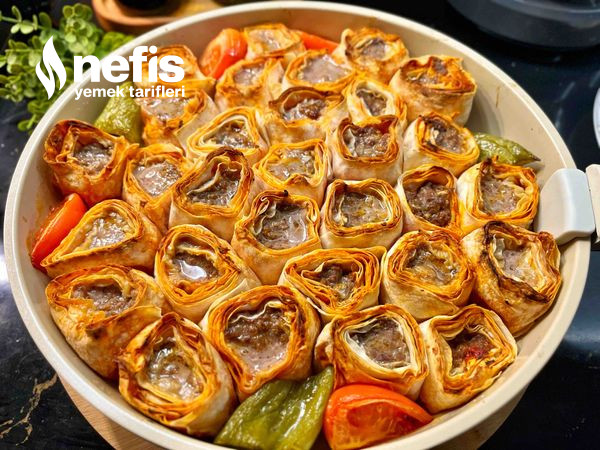 5. Yağlanmış fırın kabına yerleştirelim. Başka yufkaları da bu halde yapıp üzerlerine sıvı yağ sürelim.