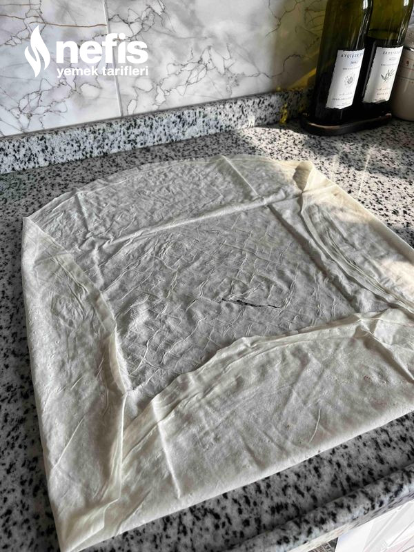 5. Sardığımız yufkaları ikişer yahut üçer parmak kalınlığında kesip tepsiye diziyoruz.