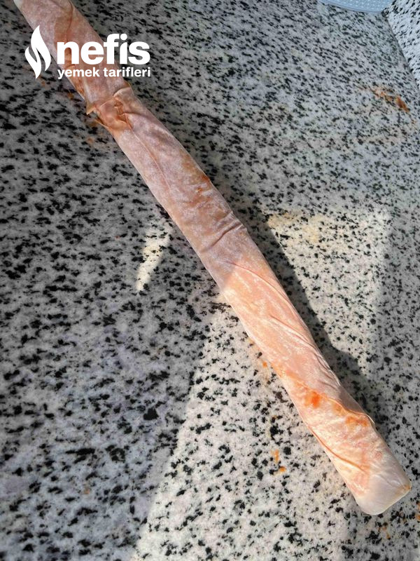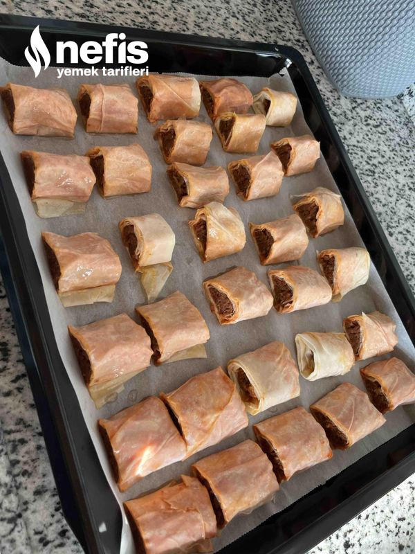 4. Önceden buzdolabında 1 saat dinlendirdiğimiz kıyma harcını fotoğraftaki halde yufkanın içine ekleyip sarıyoruz.
