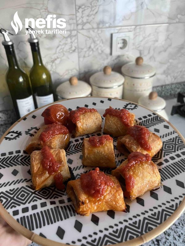 3. Yufkaları fotoğraftaki formda katlayıp salçalı sosu yufkanın her tarafına gelecek formda sürüyoruz.