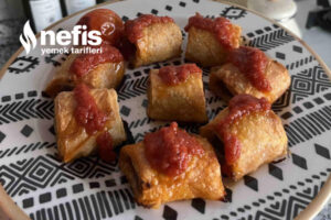 9. Fırında pişirdiğimiz beytileri sunum tabağına alıp üzerine domates sosu gezdiriyoruz yanına yoğurt ekleyip sunumu tamamlayabilirsiniz.