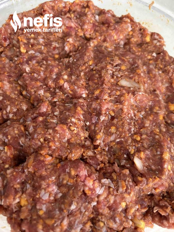 1. 1 orta uzunluk soğan rondodan geçirilir baharat, kıyma, sarımsak ve salçayla birlikte yoğurulur 1 saat buzdolabına alınıp dinlendirilir.