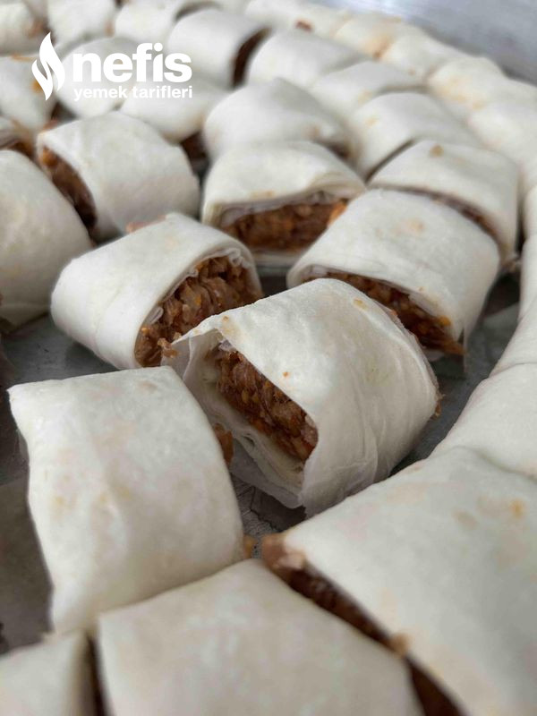 4. Harç yerleştirildikten sonra yufka sıkıca rulo formunda sarılır. Uzunlamasına sarılan yufka eşit büyüklükte küçük kareler halinde kesilir. Tepsiye dizilir.