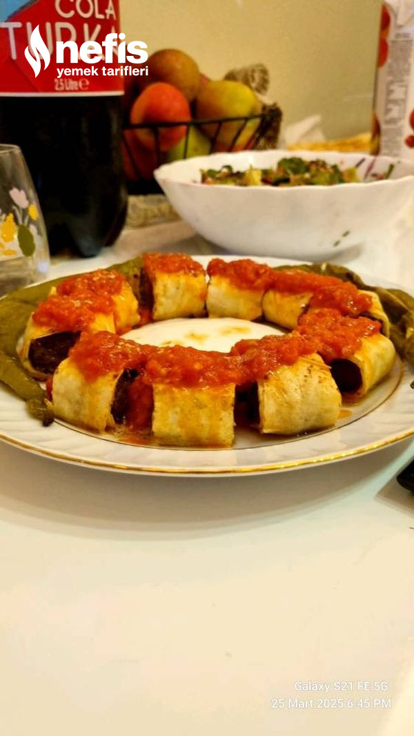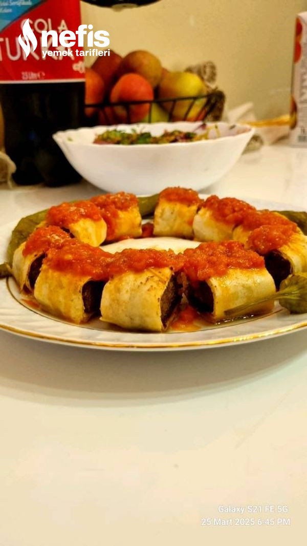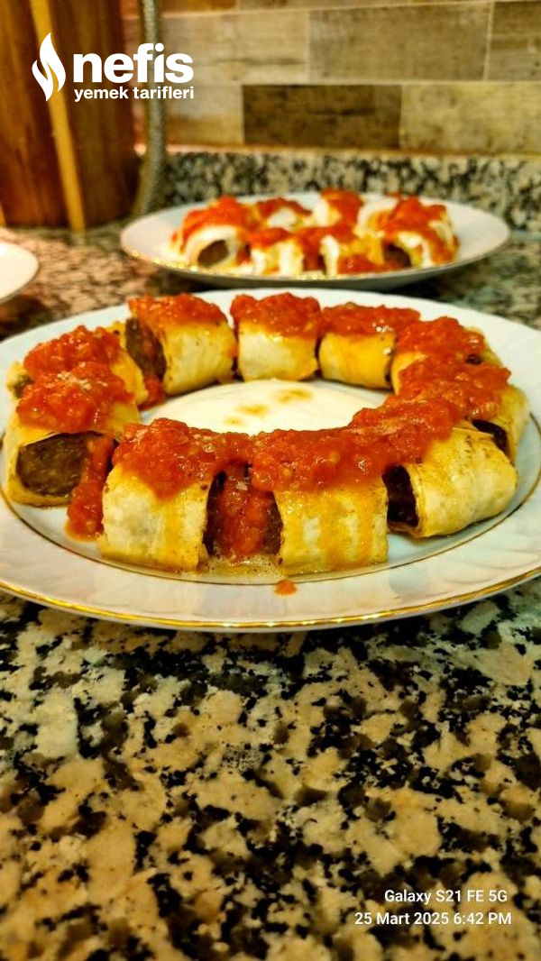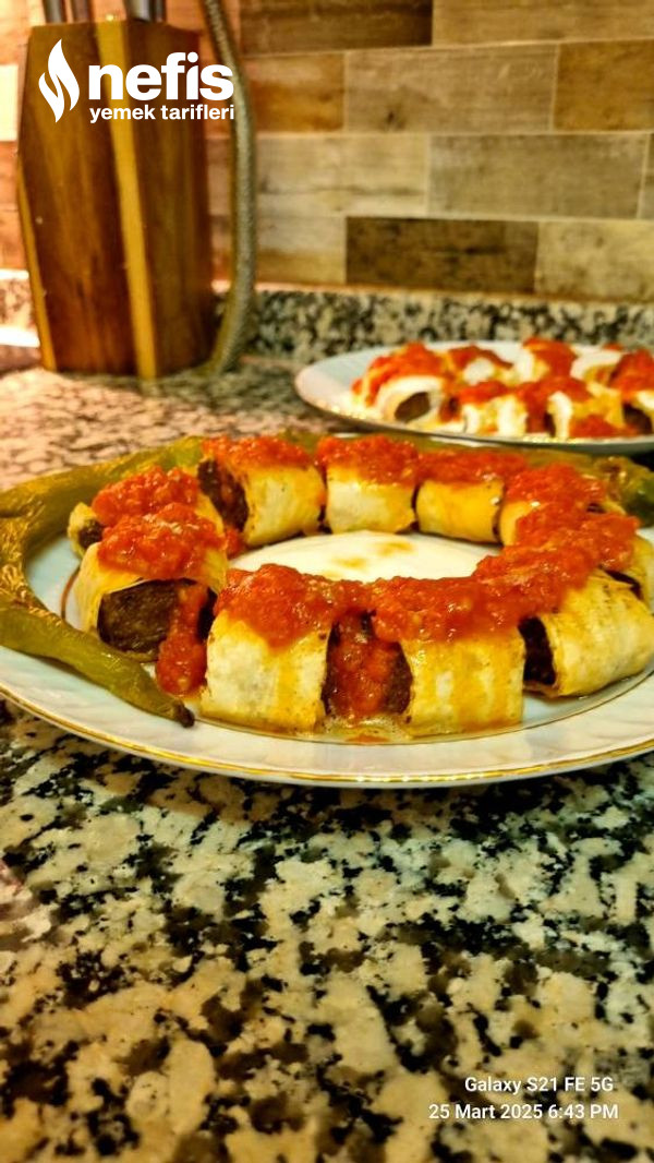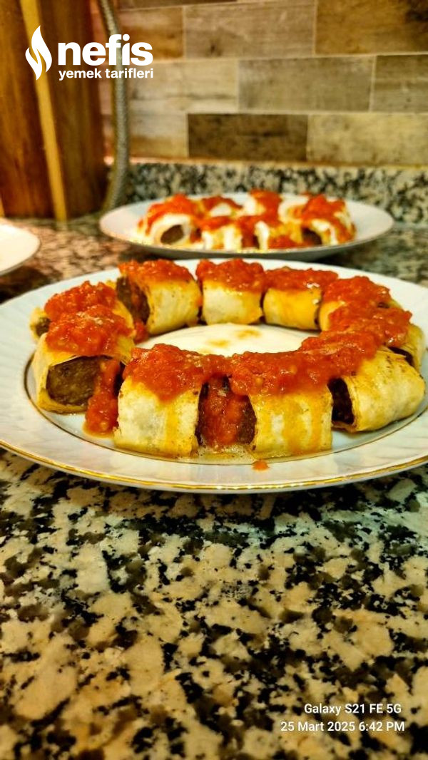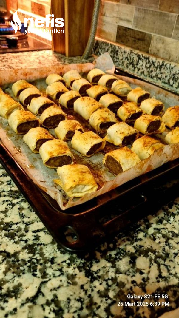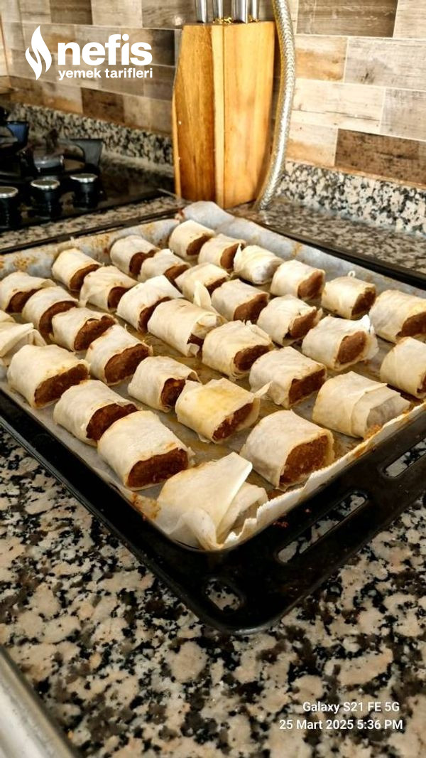 - Fırından aldığımız köfteleri yufkanın geniş kısmına boşluk bırakmadan tek sıra halinde diziyoruz yufkanın kenarlarını katlayarak rulo formunda sarıyoruz.
