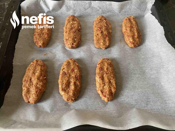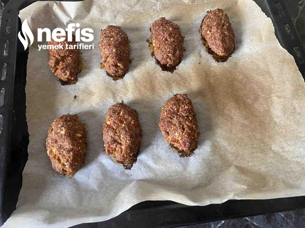 - 3 parmak kalınlığı halinde ve yaklaşık 10 cm kadar uzunluğunda kebaplara form vererek tepsiye dizilir.