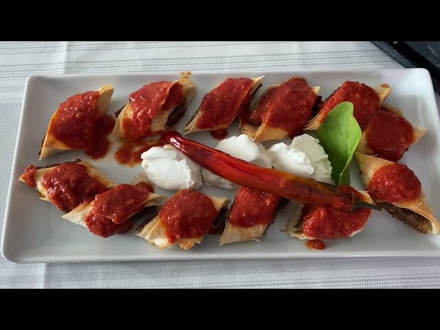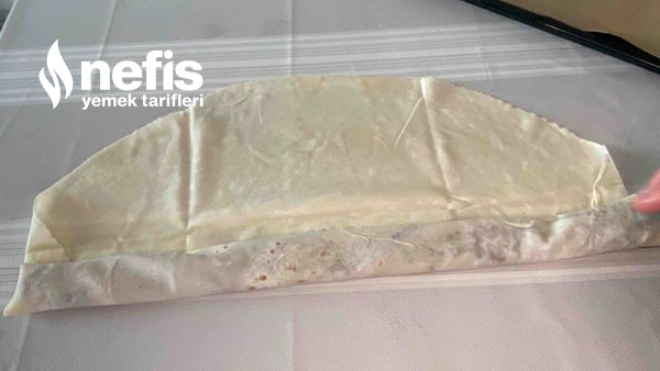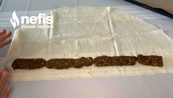 4. Yufkalarımızı ikiye keselim. Kestiğimiz yarımın üzerine fırça yardımıyla yağ sürelim fırından çıkarttığımız köftelerimizi yufkanın geniş kısmına boşluk kalmayacak biçimde tek sıra halinde koyup kenarlarından katlayarak rulo halinde saralım, tüm detayları görüntüde görebileceksiniz.