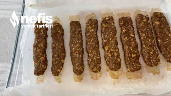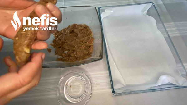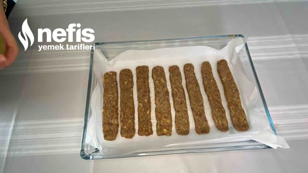 2. Köfte harcığından avuç içi büyüklüğünde kesimler kopararak uzun ve yassı bir hal verelim hazırladığımız köftelerimizi pişirme kağıdı serdiğimiz fırın tepsisine yerleştirelim.