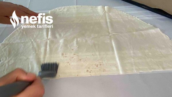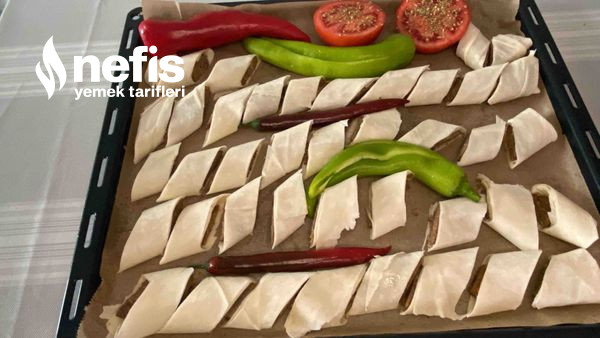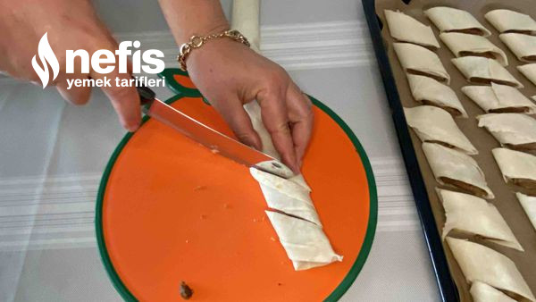 5. Üç adet yufkayı da bu halde sararak hazırlayalım ve hazırladığımız yufkaları verev olacak biçimde ikişer parmak genişliğinde keselim ve yağlı kağıt serilmiş olan tepsiye sıralayalım üzerine tekrar bir fırça yardımı ile yağ sürelim.