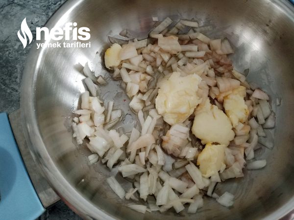 - Bir besmele bin şükürle başlayalım inşallah kuru soğan küçük yemeklik doğranır, sıvı yağ ve tereyağı tavaya konur.