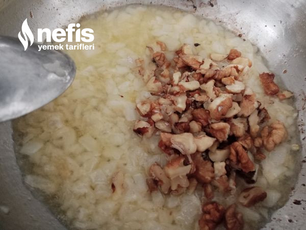 - Soğanlar pembeleşince cevizi de ekleyip bir dakika karıştırılır ,üzerine bir tatlı kaşığı biber salçasını ,baharatları ve tuzu eklenip karıştırılır.