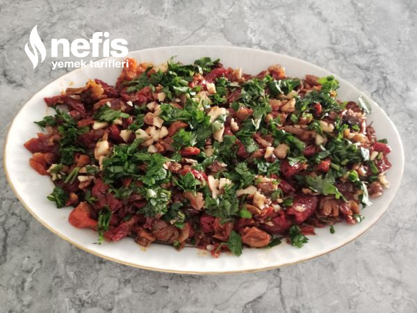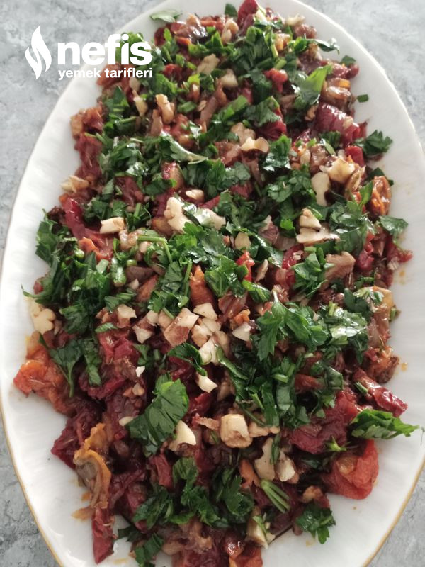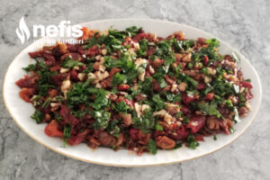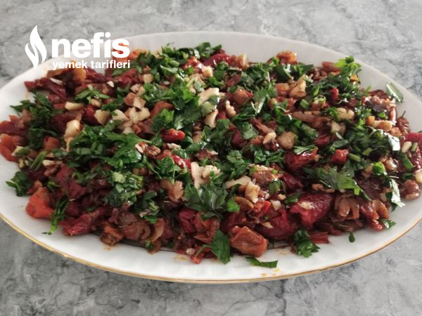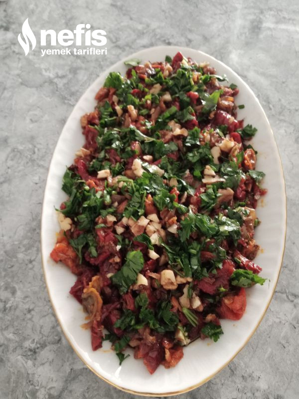- Servis tabağına alınıp üzerine bir tutam kıyılmış maydanoz ve ceviz serpiştirilir.