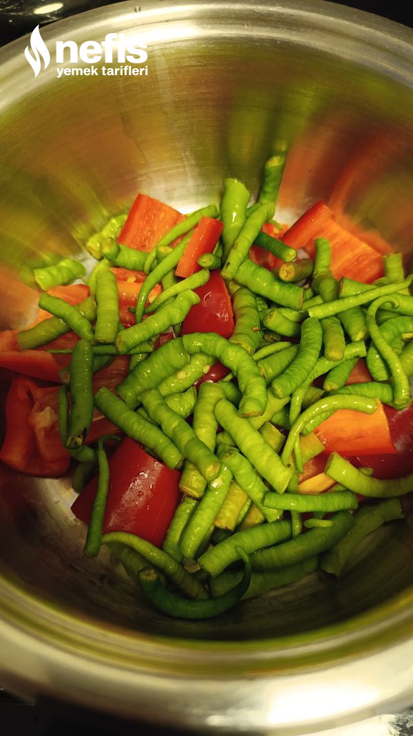 1. Biberlerimizi tohumlarından ayırıp yıkıyoruz. Akabinde irice doğruyoruz.