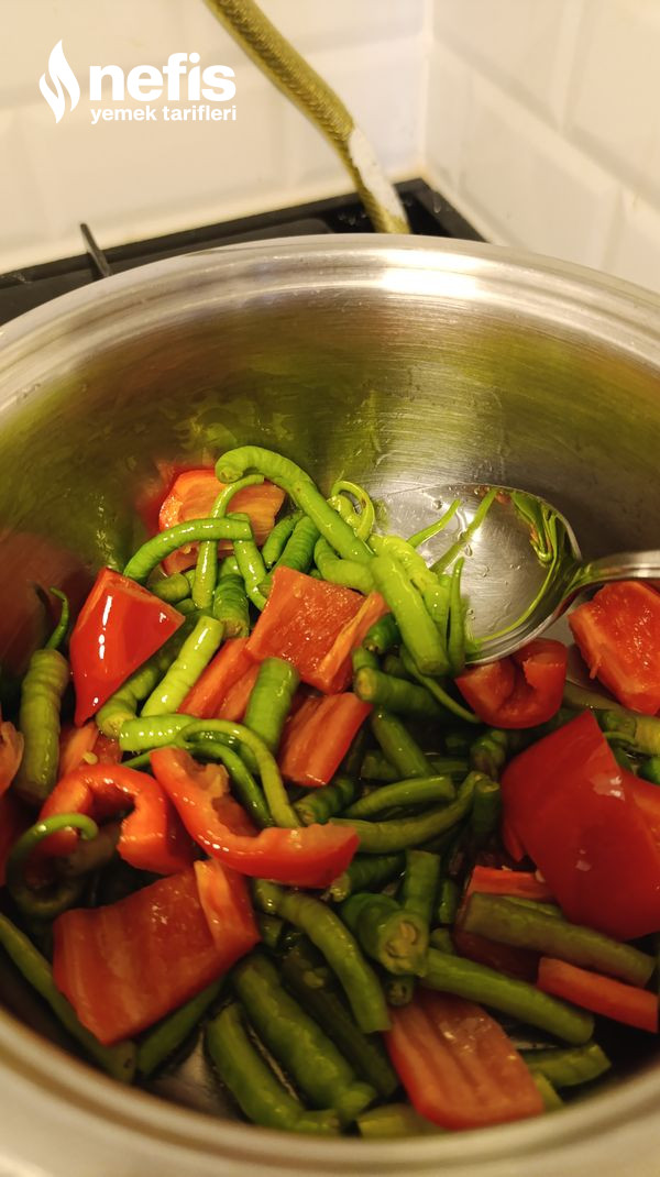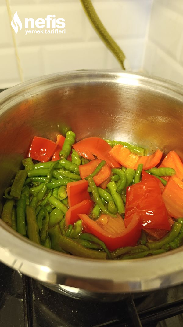 2. Küçük bir tencereye sıvı yağı ve biberleri koyup karıştırıp tencerenin kapağını kapatıyoruz. Yumuşayana kadar pişiriyoruz. Ilımaya bırakıyoruz.