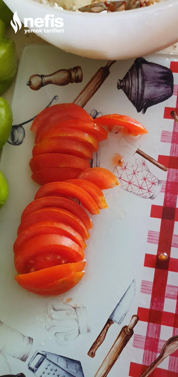 - Biberlerin içlerini doldurup üzerlerine domates dilimleri kapatıyoruz.