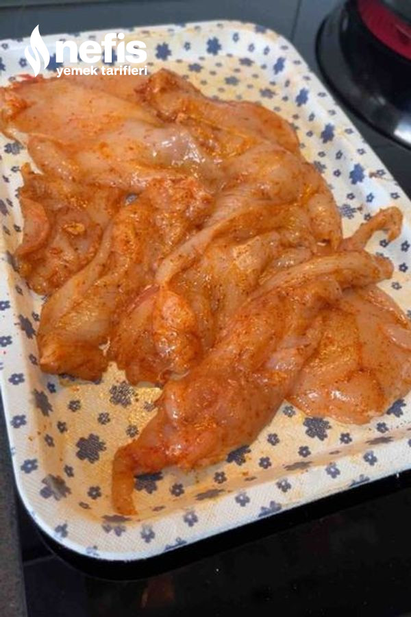 1. Tavuk etlerini enlemesine ince dilimler halinde kesip bir kabın içine alın.