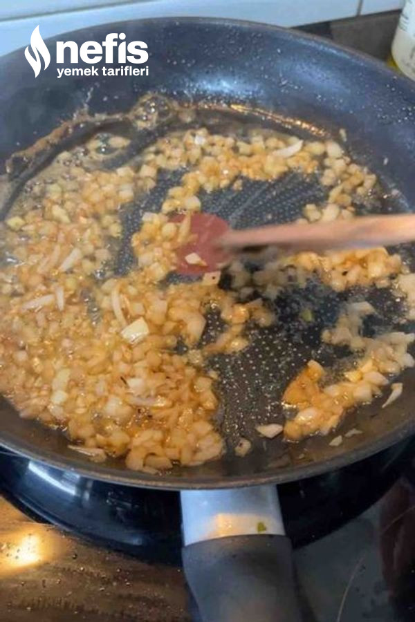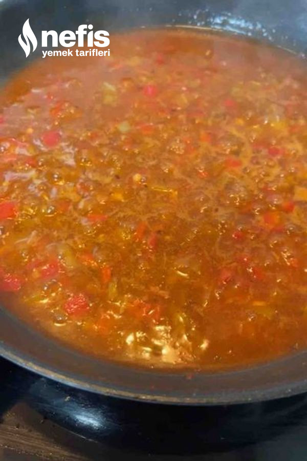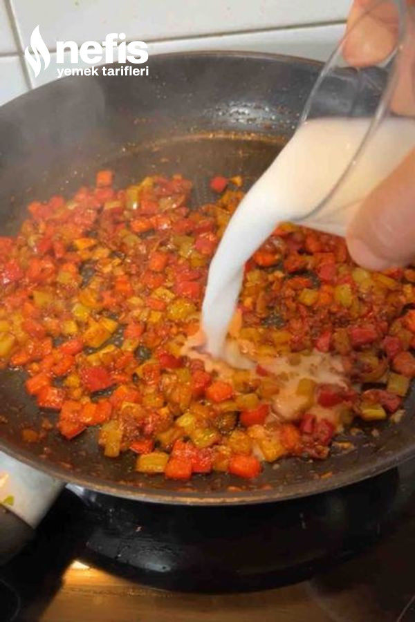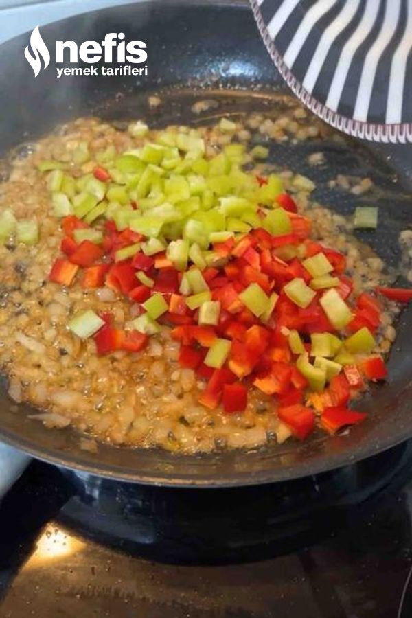 5. Üzerine küçük doğranmış biberleri ekleyip kavurun, salçayı ekleyip kokusu çıkana kadar kavurun.