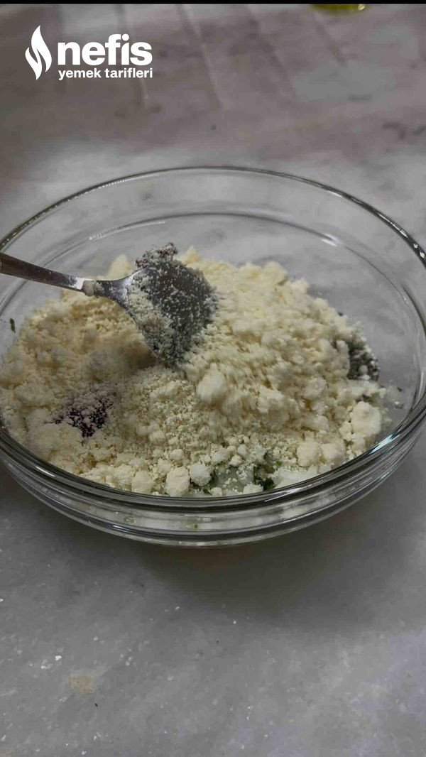 4. Karıştırma kabına üzeri için olan tüm malzemeleri(çökelek,kurusoğan,biber salçası,maydanoz,sarımsak,zeytinyağ,susam,çörek otu,kekik,kimyon)ekleyip karıştıralım.