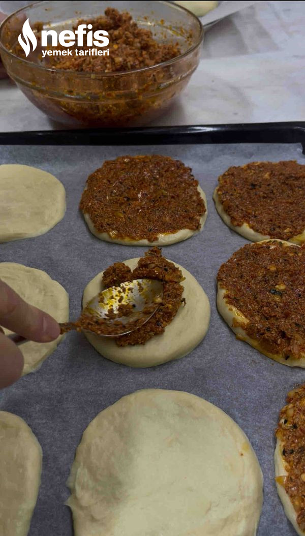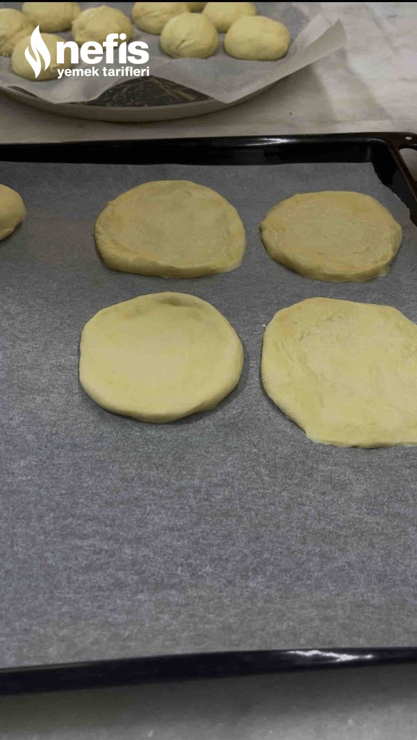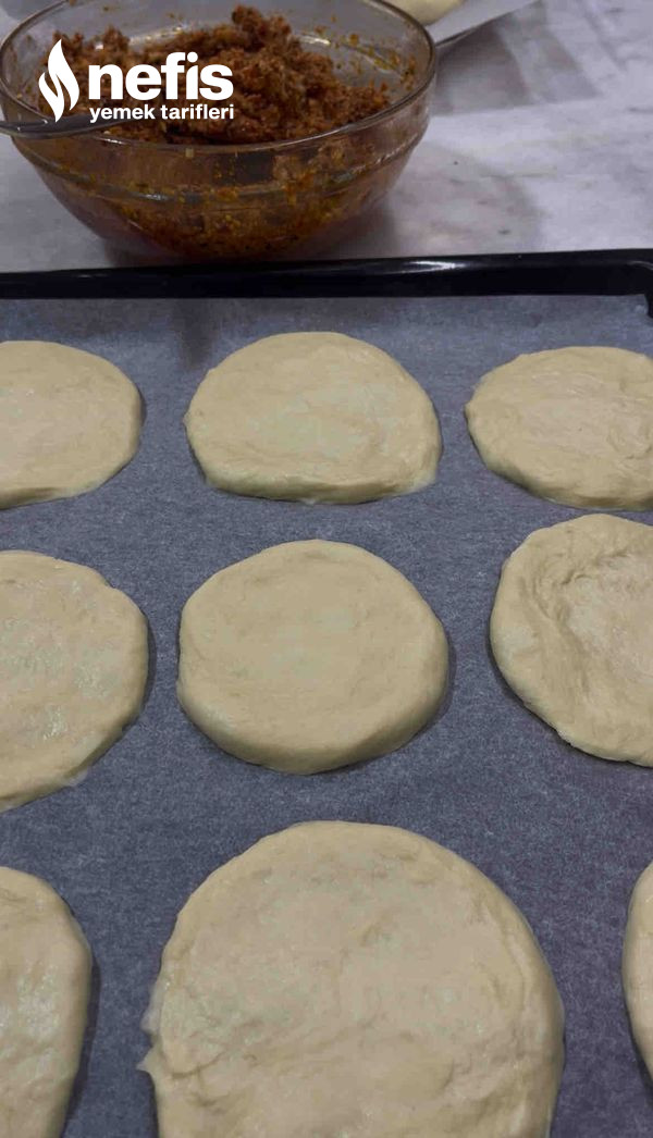 6. Bezelere ayıralım ve her bir bezenin üzerine bir yemek kaşığı harçtan yayalım, tüm bezeler bitince 15 dakika tepside mayalandıralım.