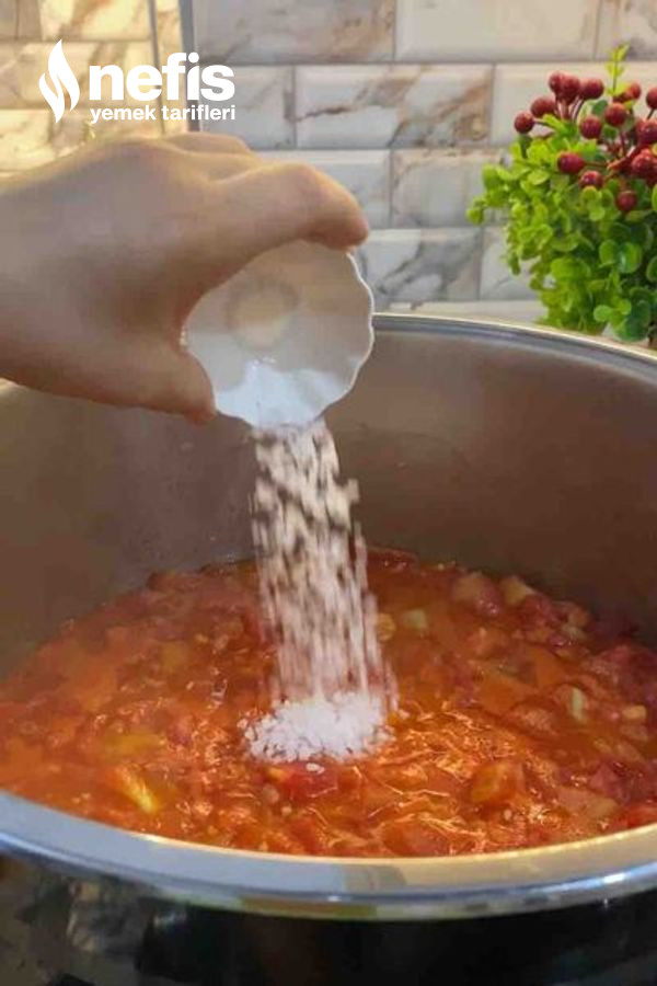 - Sonra domatesleri ve tuzu,şekeri ekleyip pişirelim.