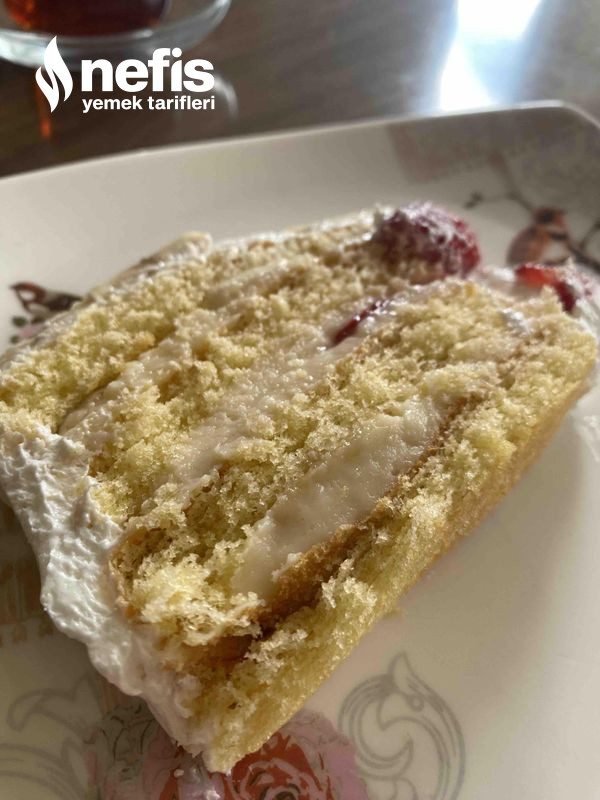 - Keki 12 üzeri kızarıncaya kadar pişirelim fırından çıkan kekimizi soğutalım üstten aşağıya 4 modüle bölelim, her bir kesimin ortasına krema muz koyalım, ikinci katına krema çilek çok yakışıyor üçüncü katına muz çilek koyalım.