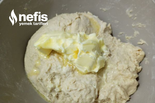 - Onun tamamını ek edip hamuru toparladıktan sonra oda ısısında yumuşamış tereyağını ekleyip hamuru 5-6 dakika daha yoğurmaya devam edelim.