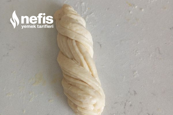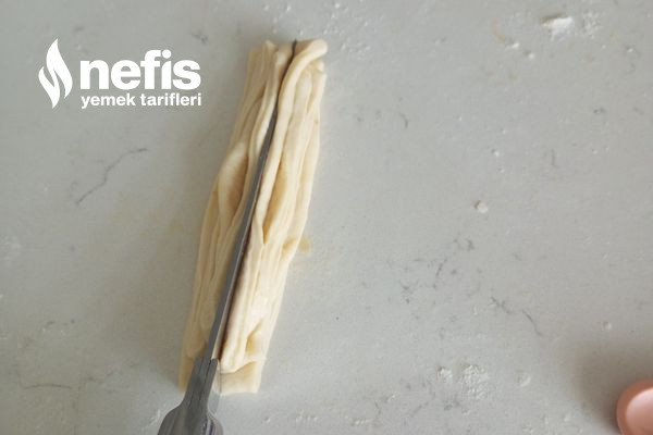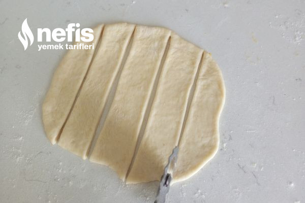 - Burgu poğaça yapmak için hazırladığımız bezeleri hafif un serperek açalım, fırça ile hafif su sürelim 6 eşit kesime kesip üst üste koyup dikine bıçakla kesip rulo formunda kıvırıp yağlı kağıt serdiğimiz tepsiye dizelim.