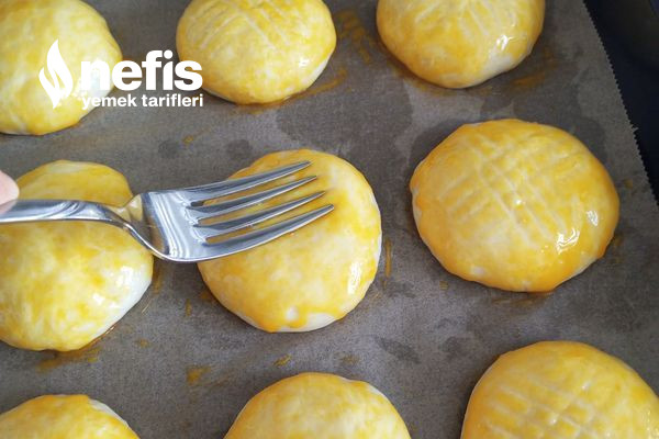 - Ben bir tepsisini yuvarlak poğaça formunda hazırladım hazırladığımız bezeleri yağlı kağıt serdiğimiz fırın tepsisine alalım üzerine yumurta sarısı sürüp çatalla çizikler yapalım evvelce ısıttığımız 200 derece fırında kızarıncaya kadar pişirelim.