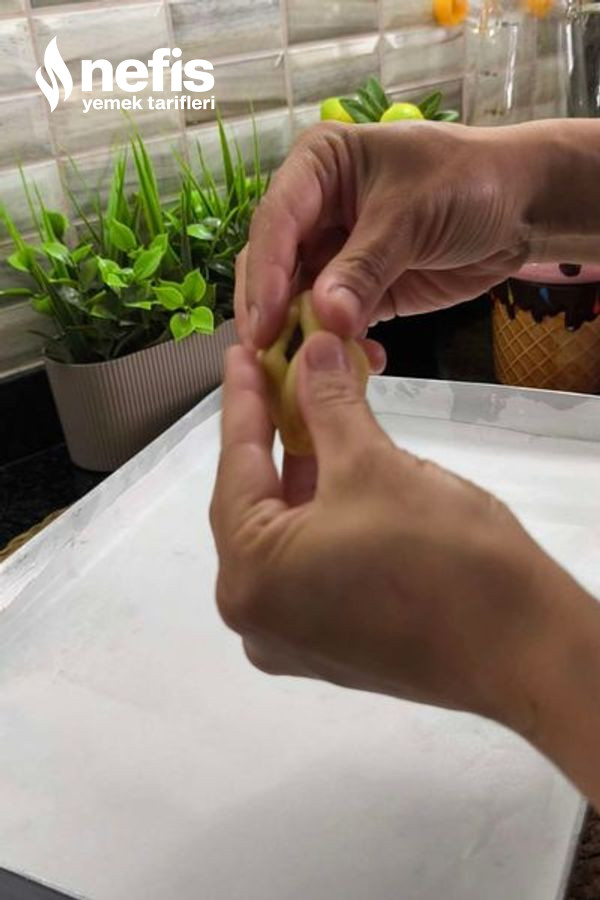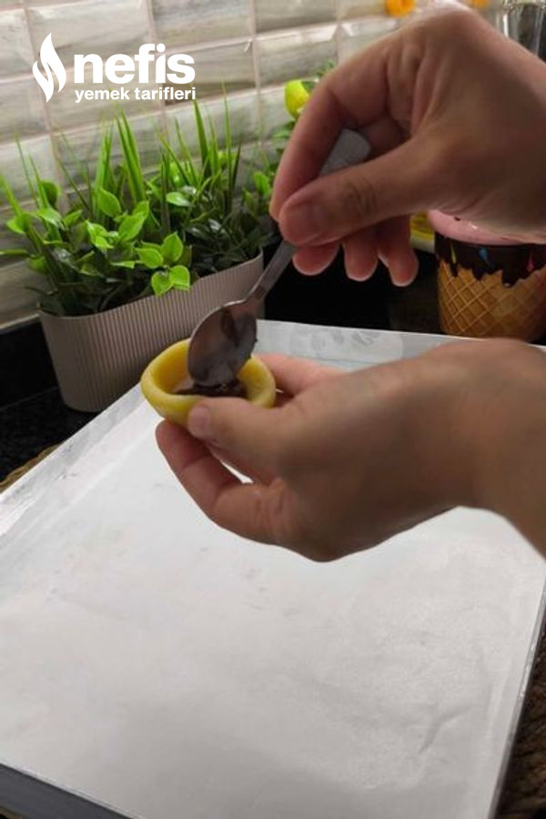 - Hamurdan ceviz büyüklüğünde modüller koparıp içini oyun, fındık kremasından 1 çay kaşığı kadar koyup ağzını kapatıp yuvarlayın ve üzerine yavaşça bastırıp yassılaştırın.