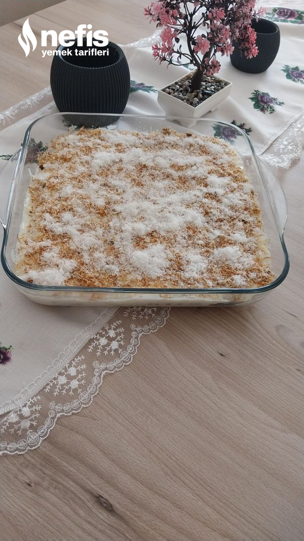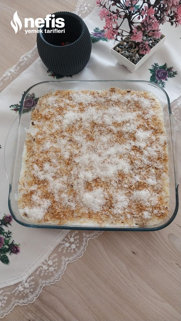 - En son muhallebiyi ekleyip üzerini düzeltikten sonra az olacak formda tekrar çıtır kadayıf ek edelim ve hindistan cevizi ile süsleyelim.