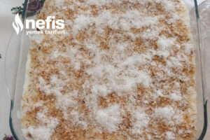 - En son muhallebiyi ekleyip üzerini düzeltikten sonra az olacak formda tekrar çıtır kadayıf ek edelim ve hindistan cevizi ile süsleyelim.