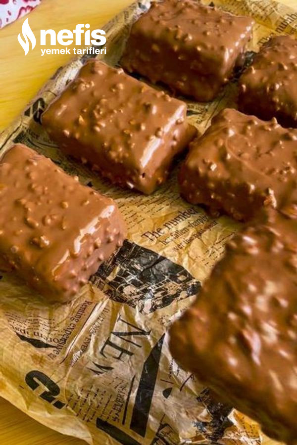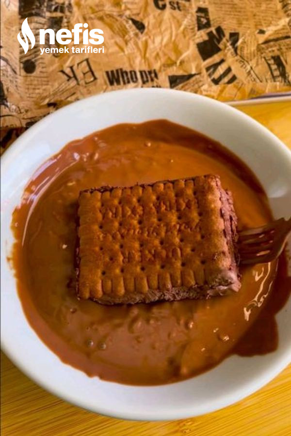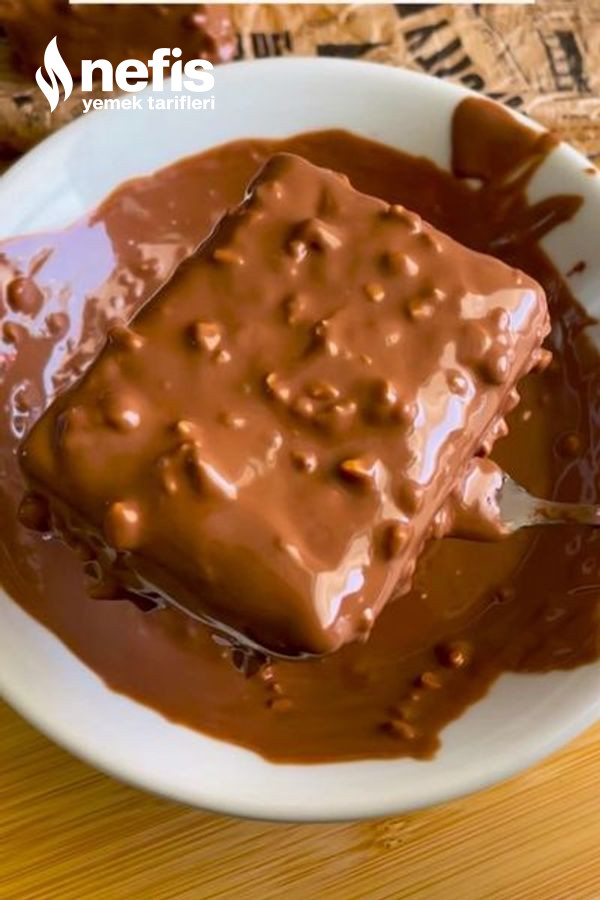 - Daha sonra buzluktan çıkardığımız bisküvi dondurmamızı dikkatli bir biçimde keserek benmari yordamı karışımına batıralım ve servis hazır.