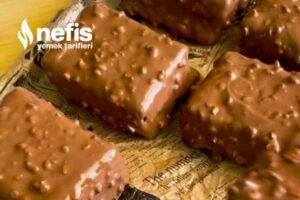 - Daha sonra buzluktan çıkardığımız bisküvi dondurmamızı dikkatli bir biçimde keserek benmari yordamı karışımına batıralım ve servis hazır.